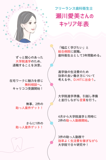 もともとは総合病院で勤務し、人間関係も良好で大きな不満はなかったという愛美さんが、大学院へ進学と同時にフリーランス歯科衛生士としての活動を始めた理由は、学費と生活費を稼ぐためでした。