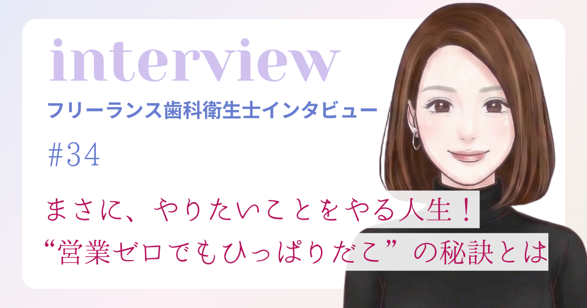あと、普通に歯科医院で働いてたらどれだけ頑張ってもお給料にはなかなか反映されないけど、やっぱフリーになることで、自分が頑張ることでどれだけでも可能性はあるなぁと思って。フリーだと保証はないかもしれないけど…まわりからも、すごい勇気あるね〜とか、よくそんな、衛生士でフリーランスになったねとか、保険の面とかどうなのとかすごい言われるんですけど、でもそれは結局パートも一緒なんですよね。正社員じゃないなら結局一緒なので、まぁそこらへんはそんなに気にしてないかな。やり方はもう、無限にある。だからほんとに、フリーになって私は良かったなって思います。