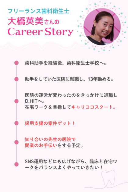 D.HITで働き方を変えた歯科衛生士にインタビュー。今回は、13年勤めた歯科医院を退職してフリーランスになった、大橋英美さんです。