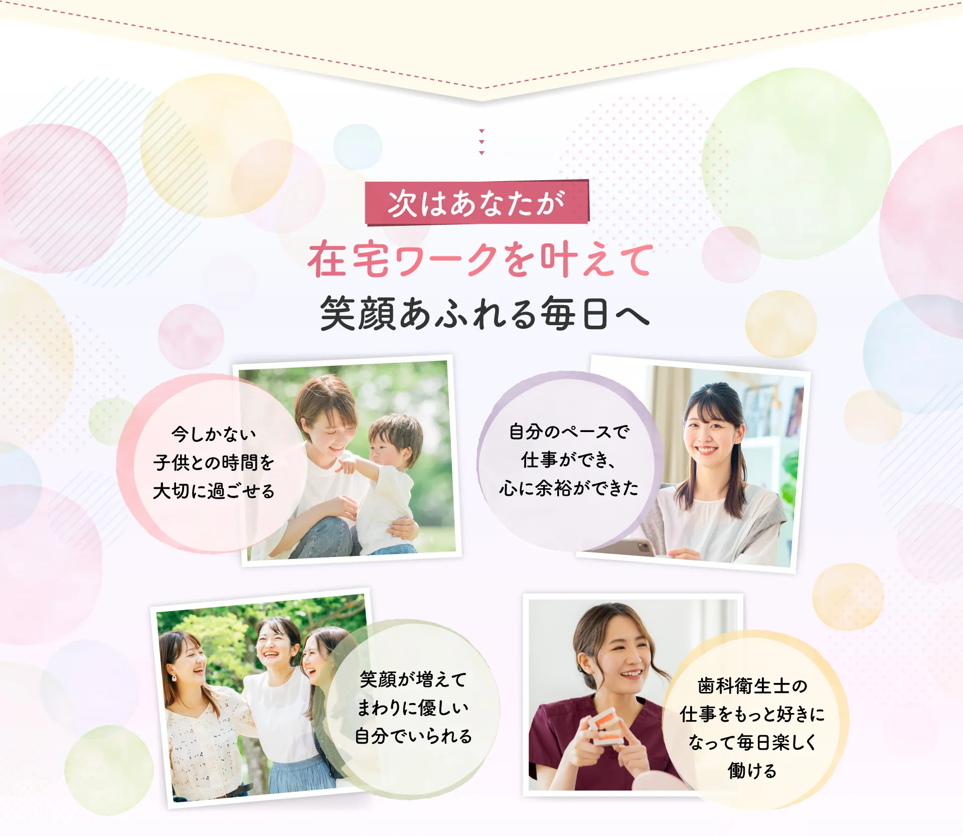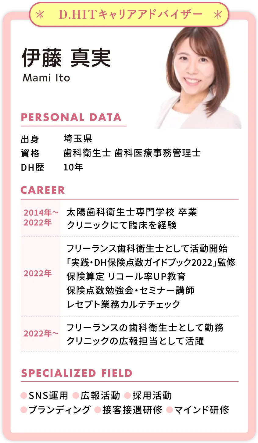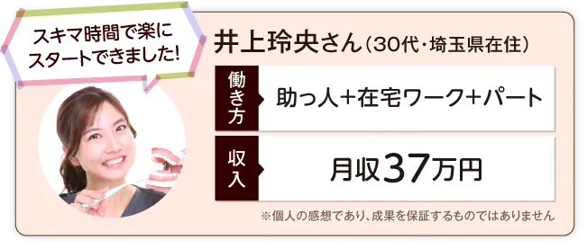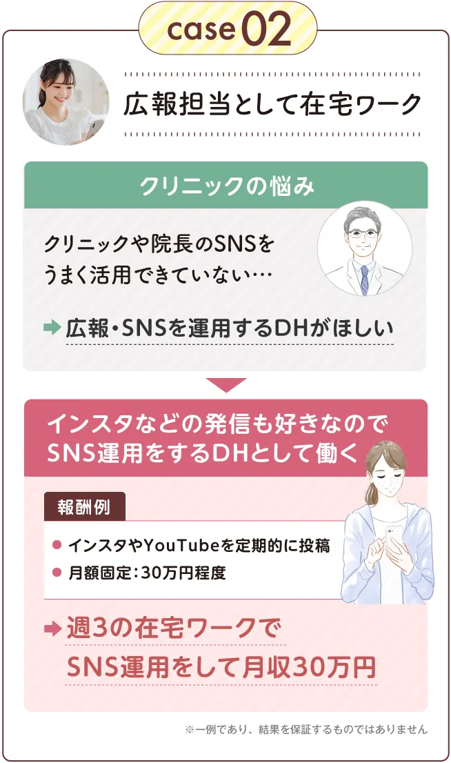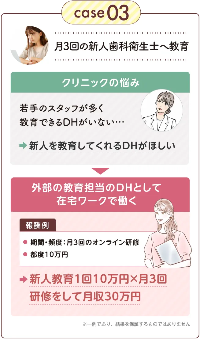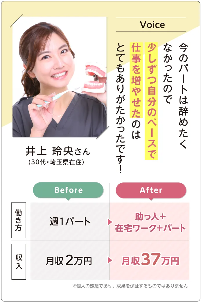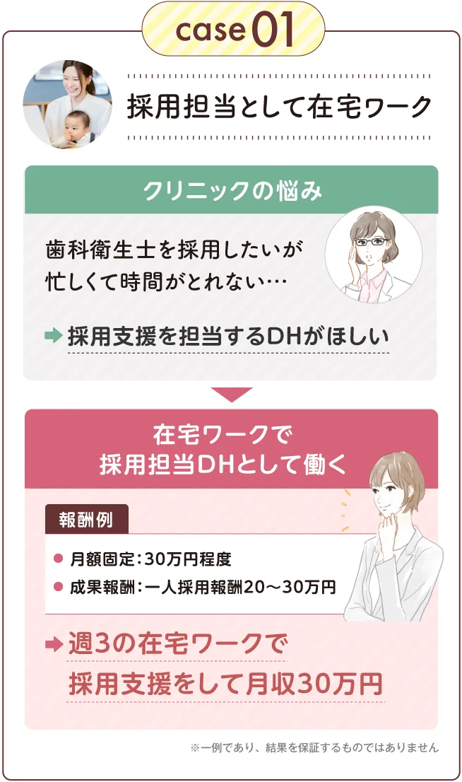 歯科衛生士の国家資格をお持ちの方であればどなたでも実現できる働き方ですのでご安心ください。