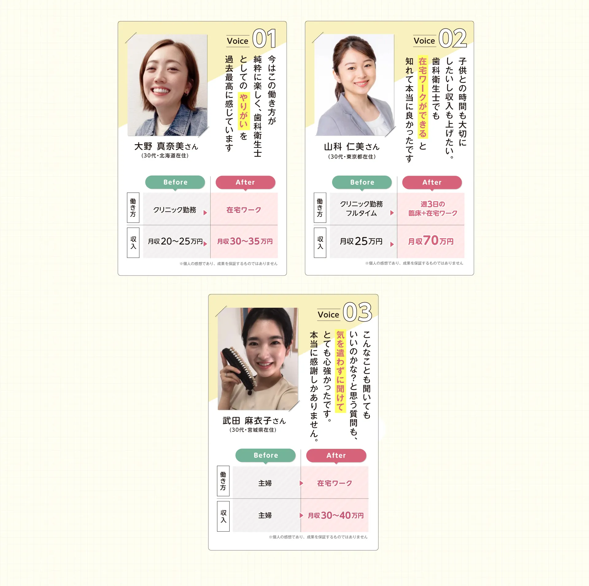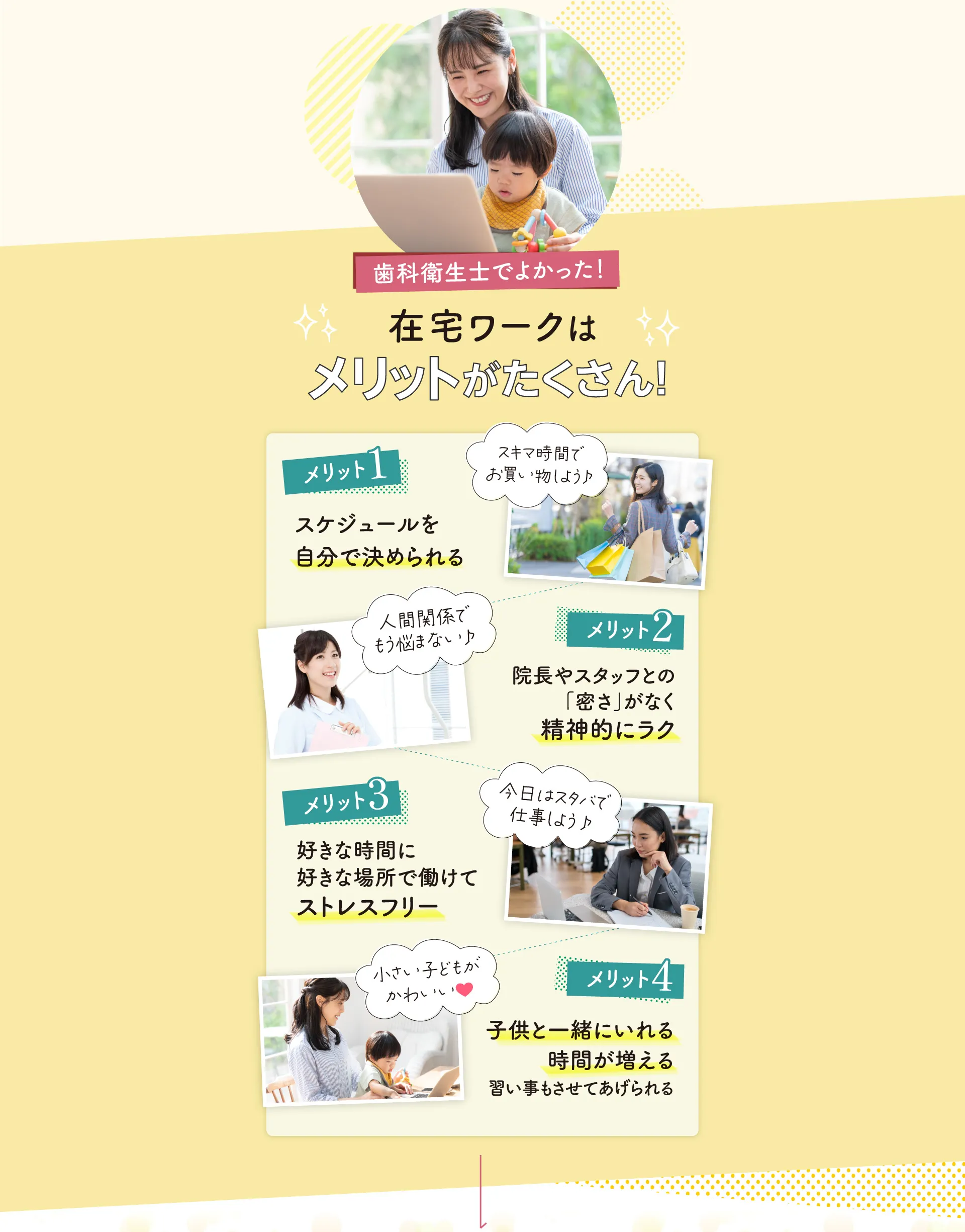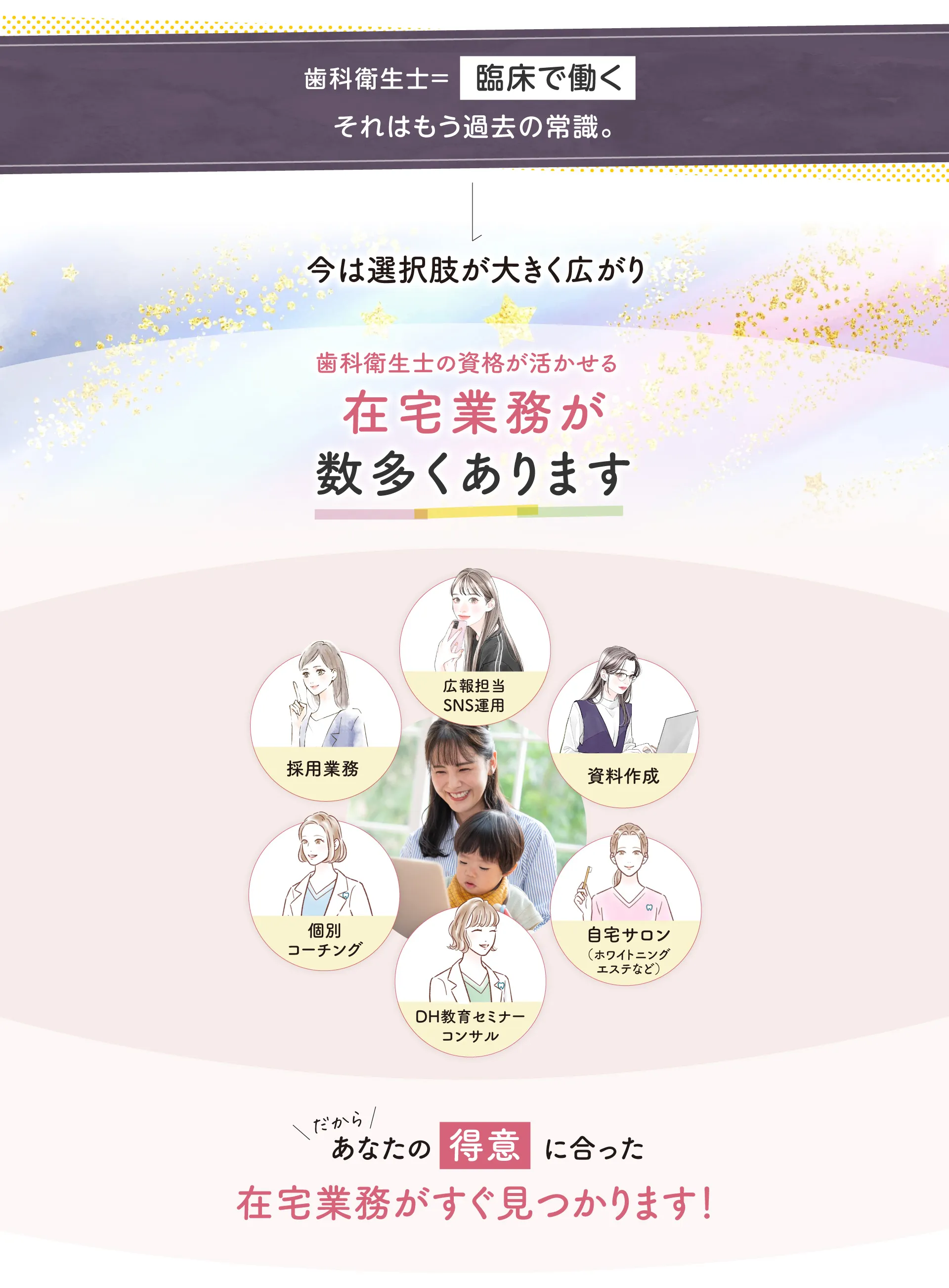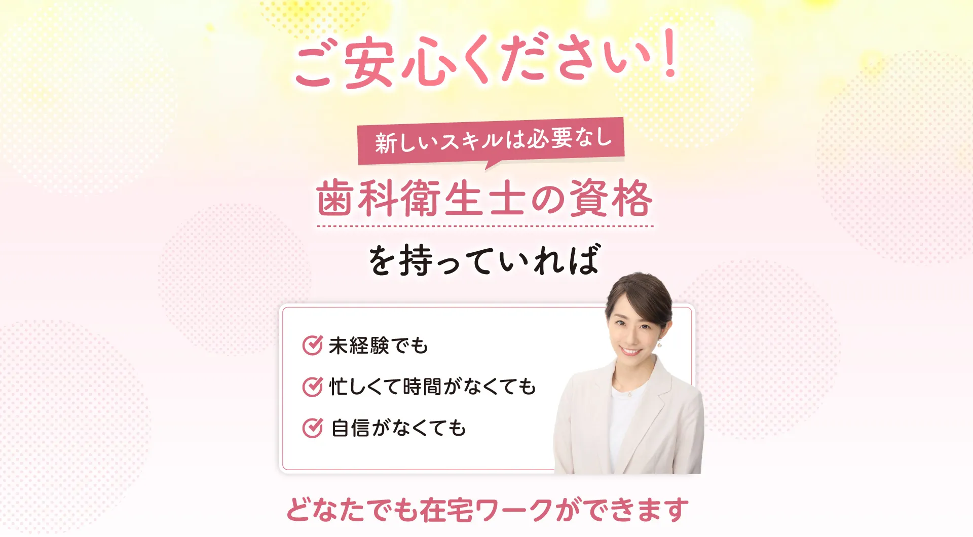 歯科衛生士の国家資格をお持ちの方であればどなたでも実現できる働き方ですのでご安心ください。