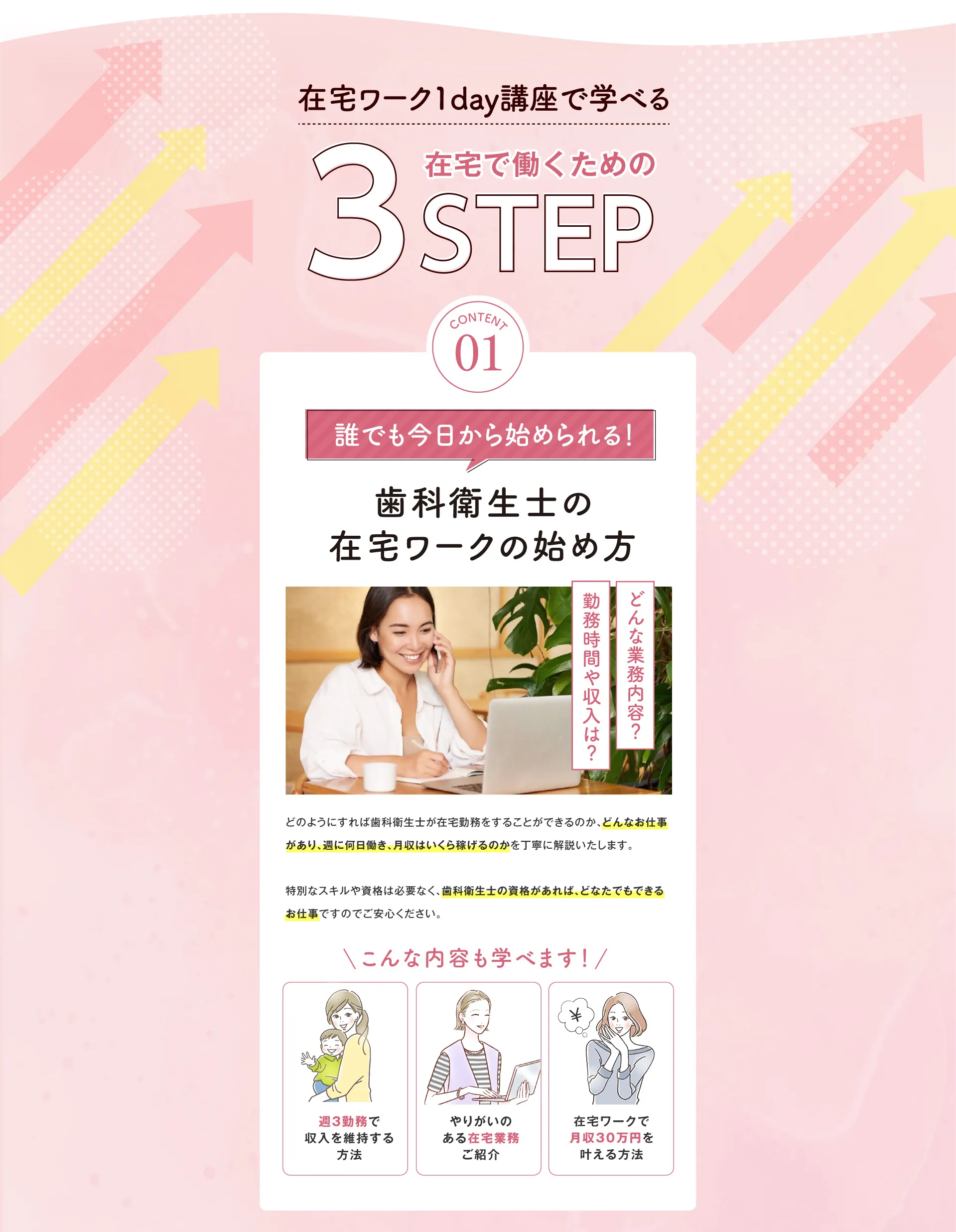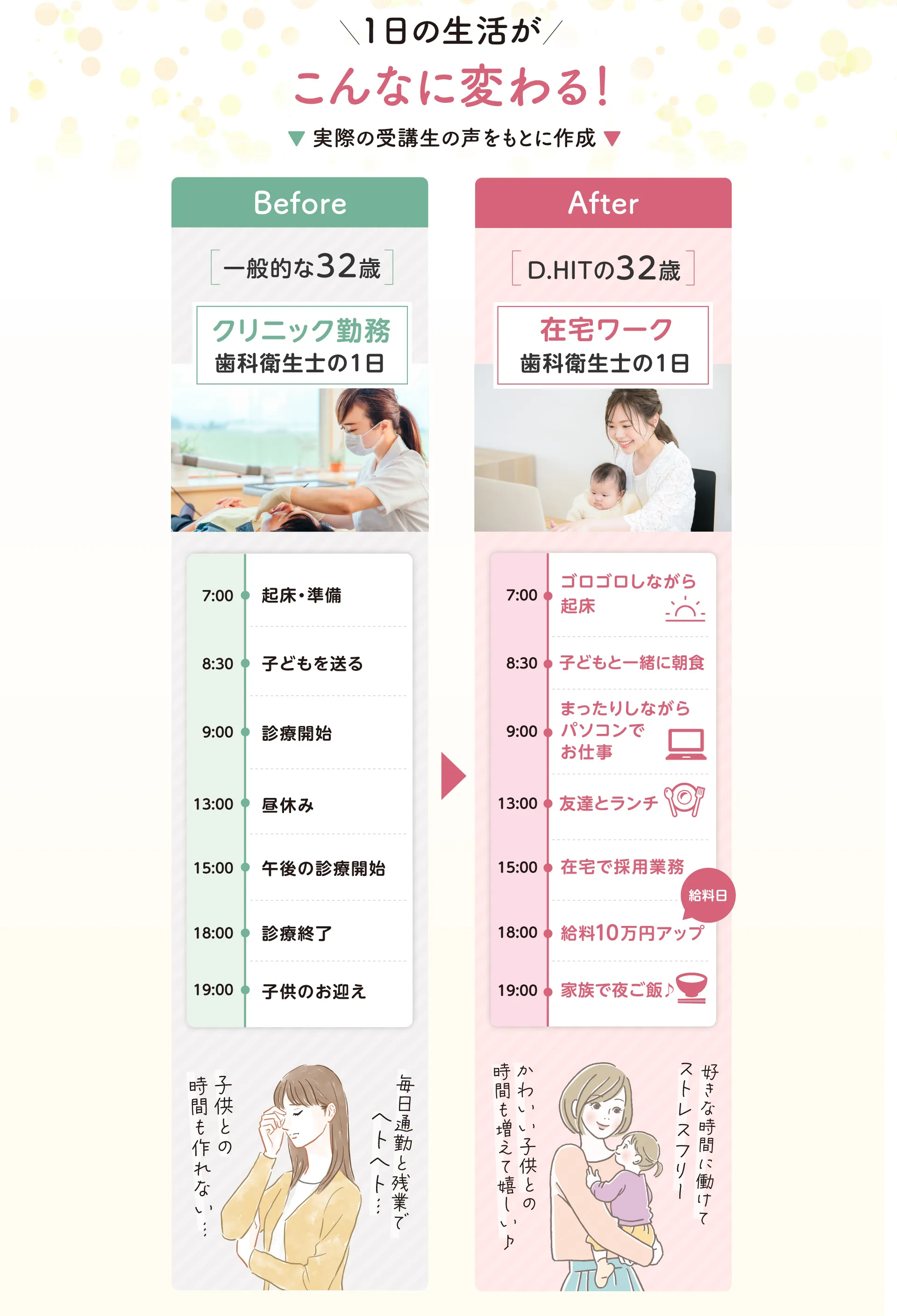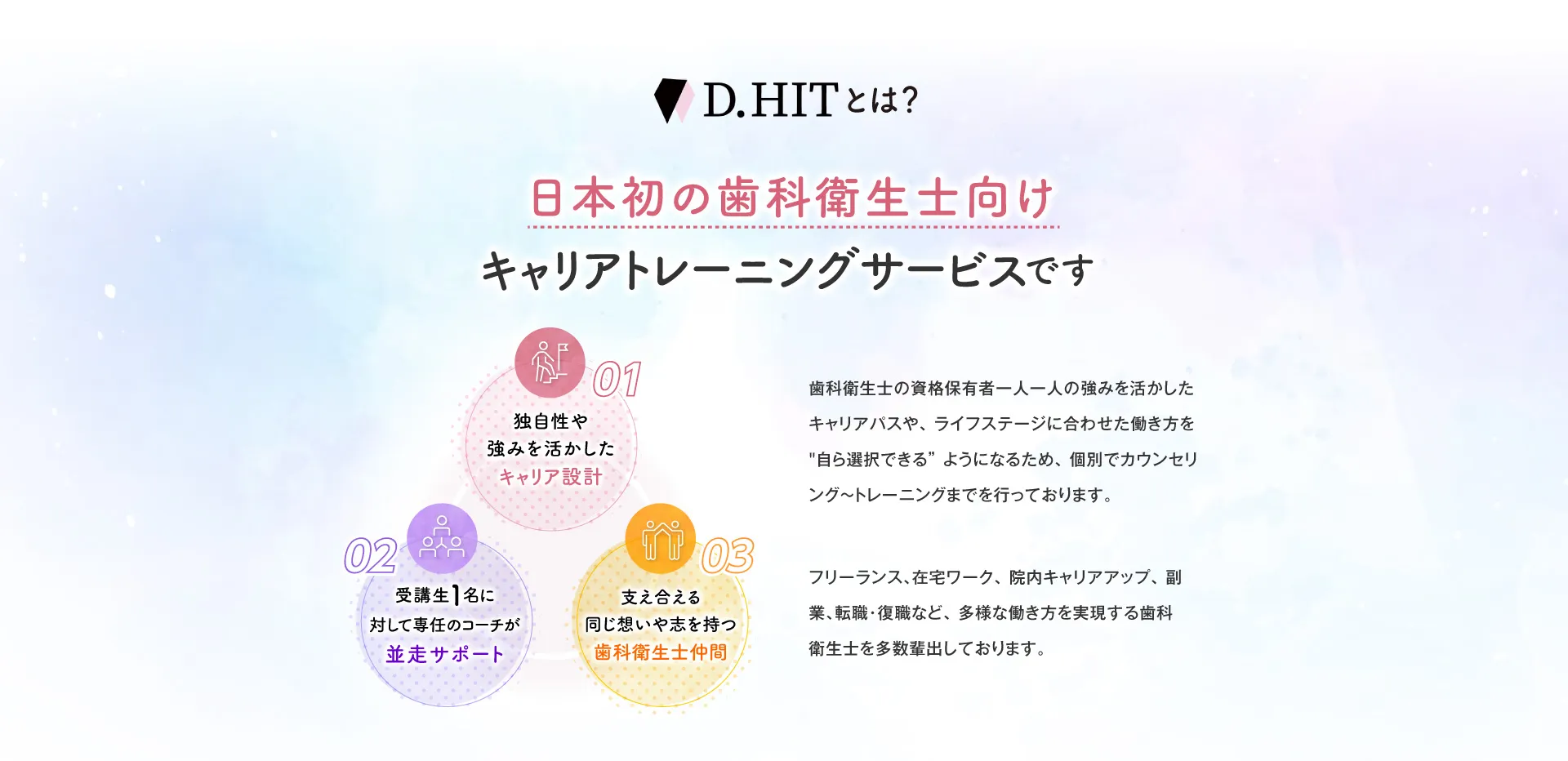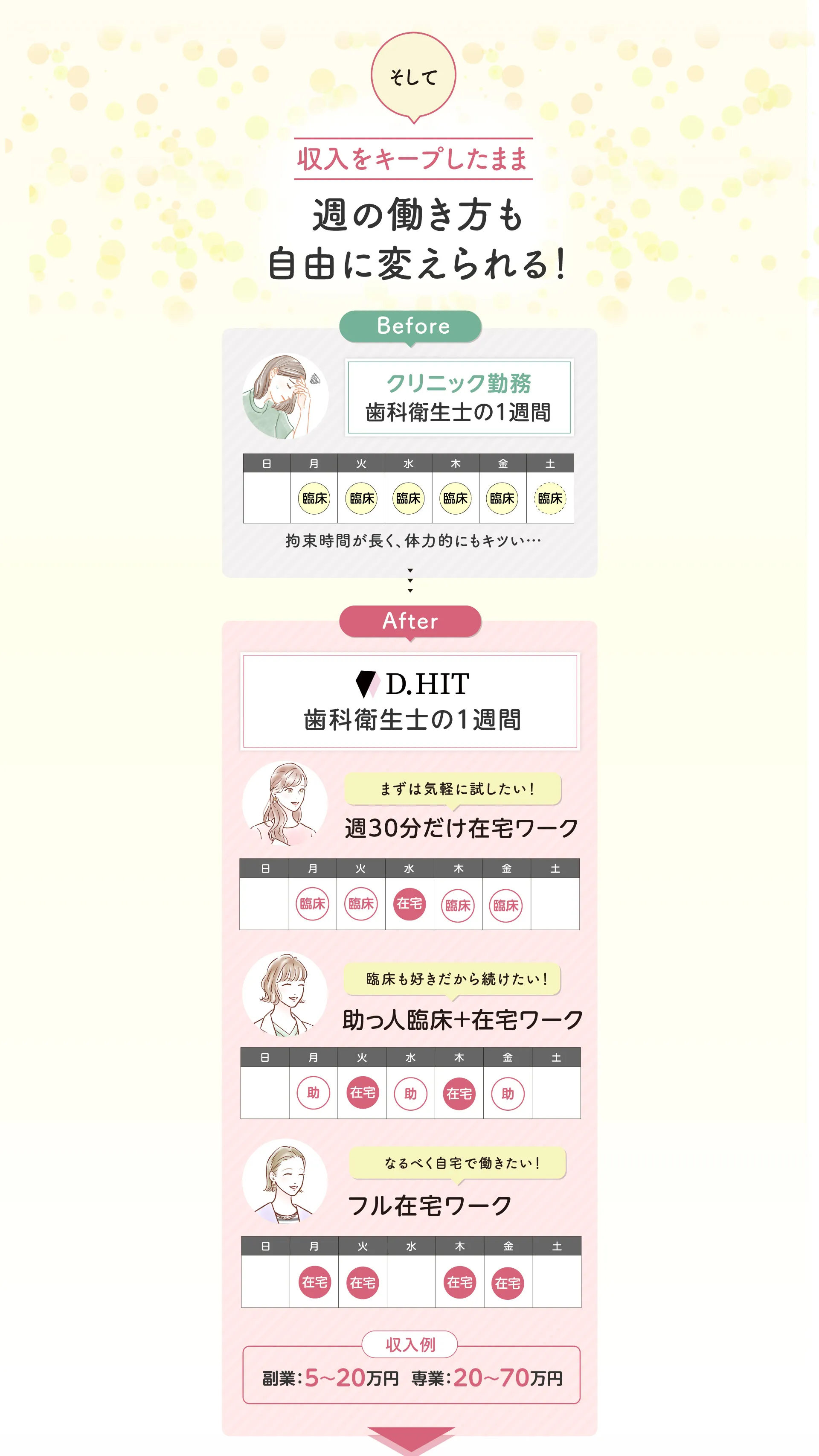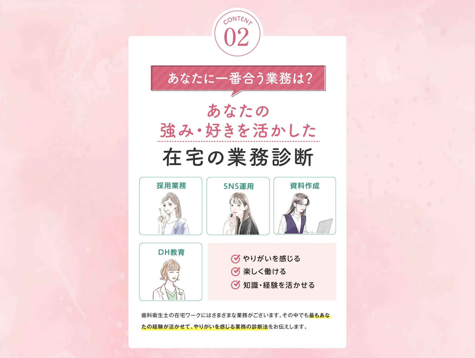 歯科衛生士の国家資格をお持ちの方であればどなたでも実現できる働き方ですのでご安心ください。