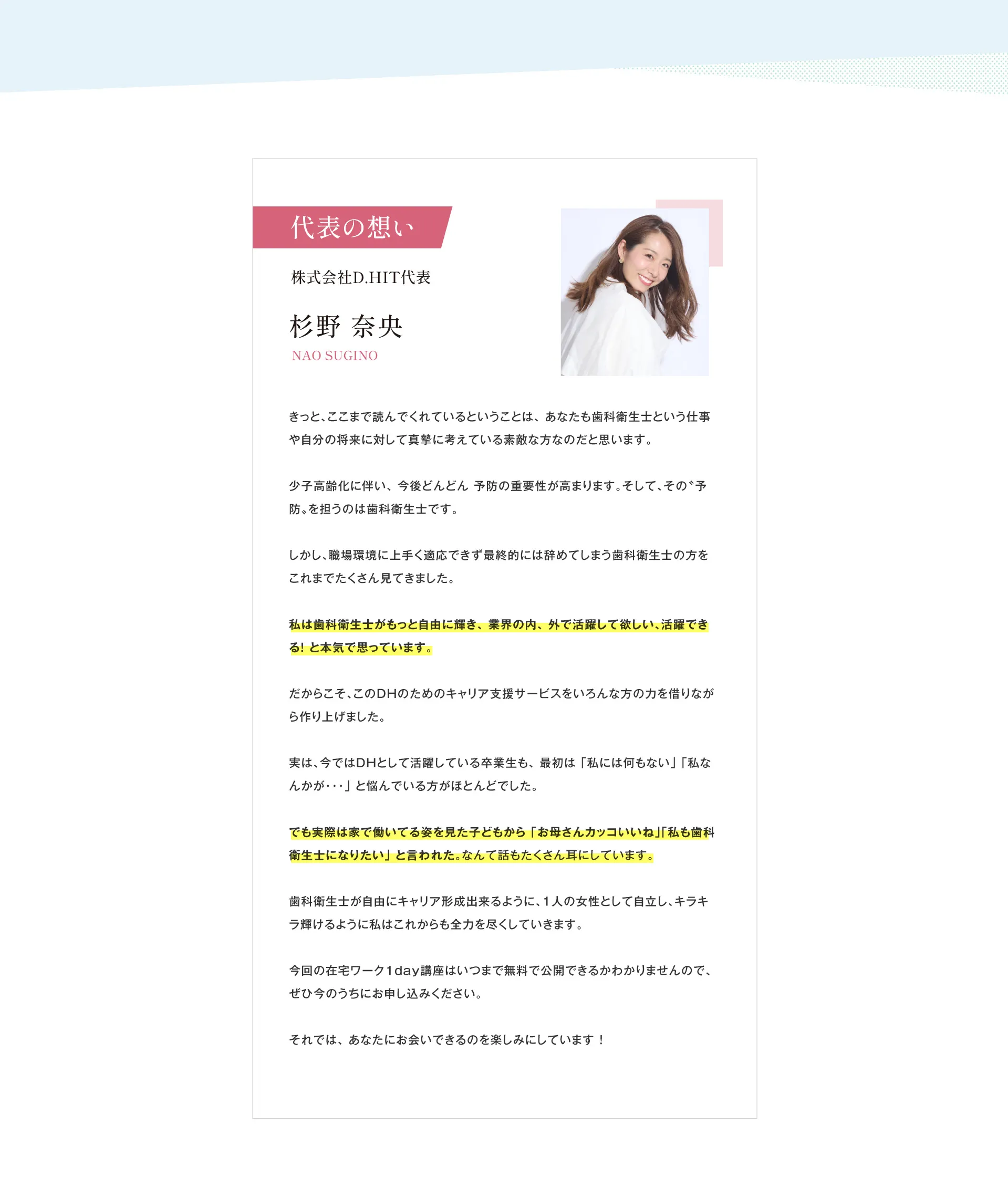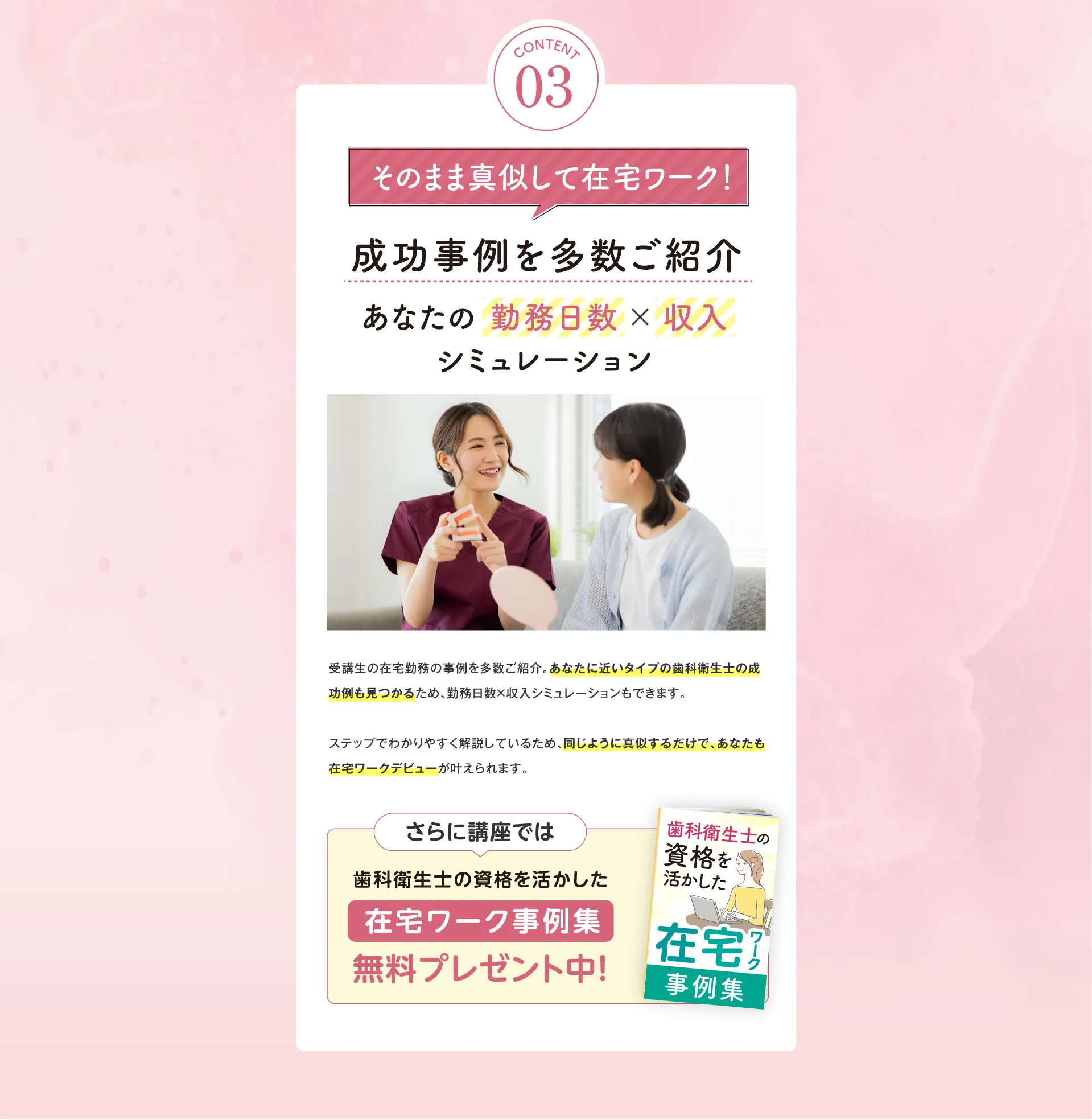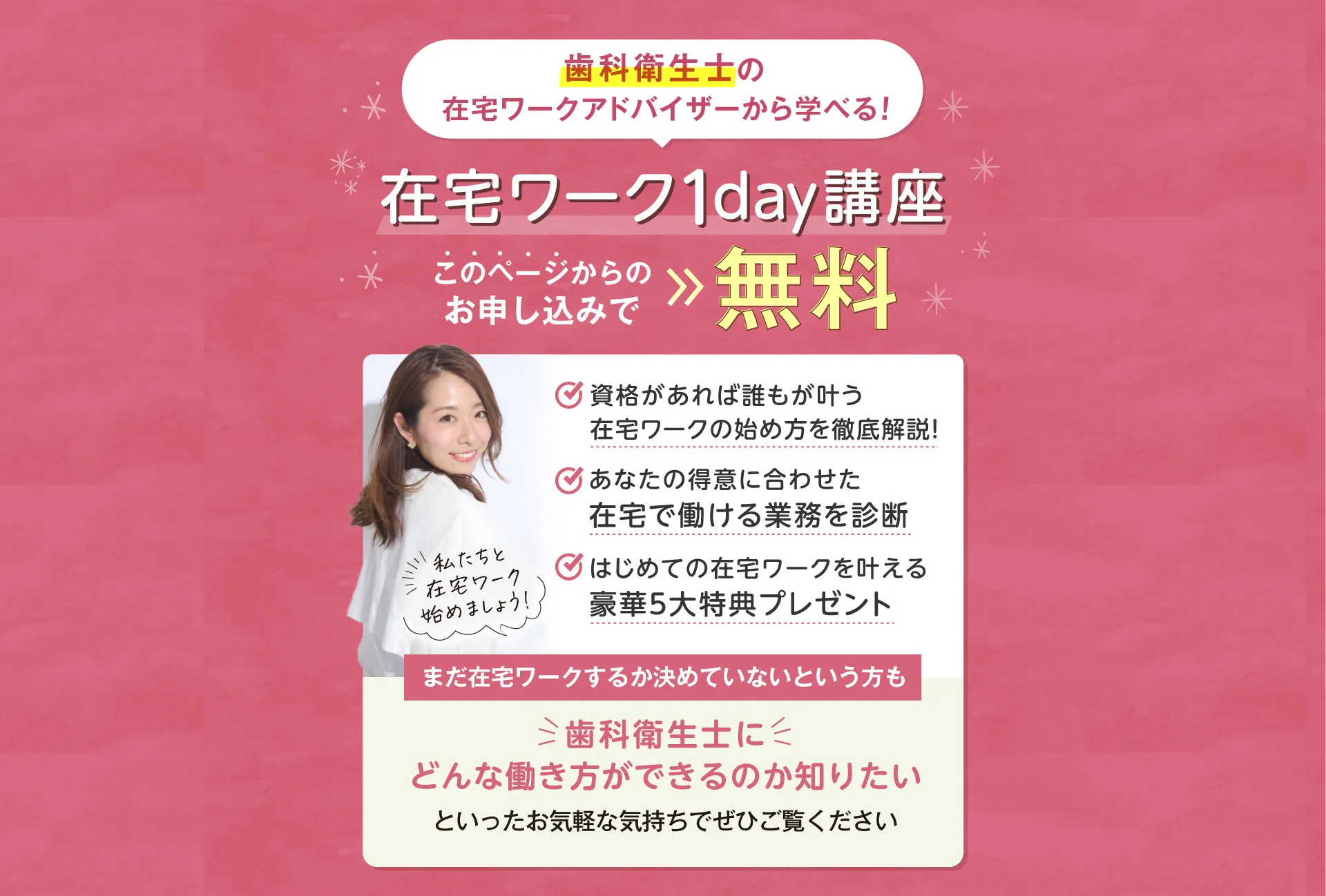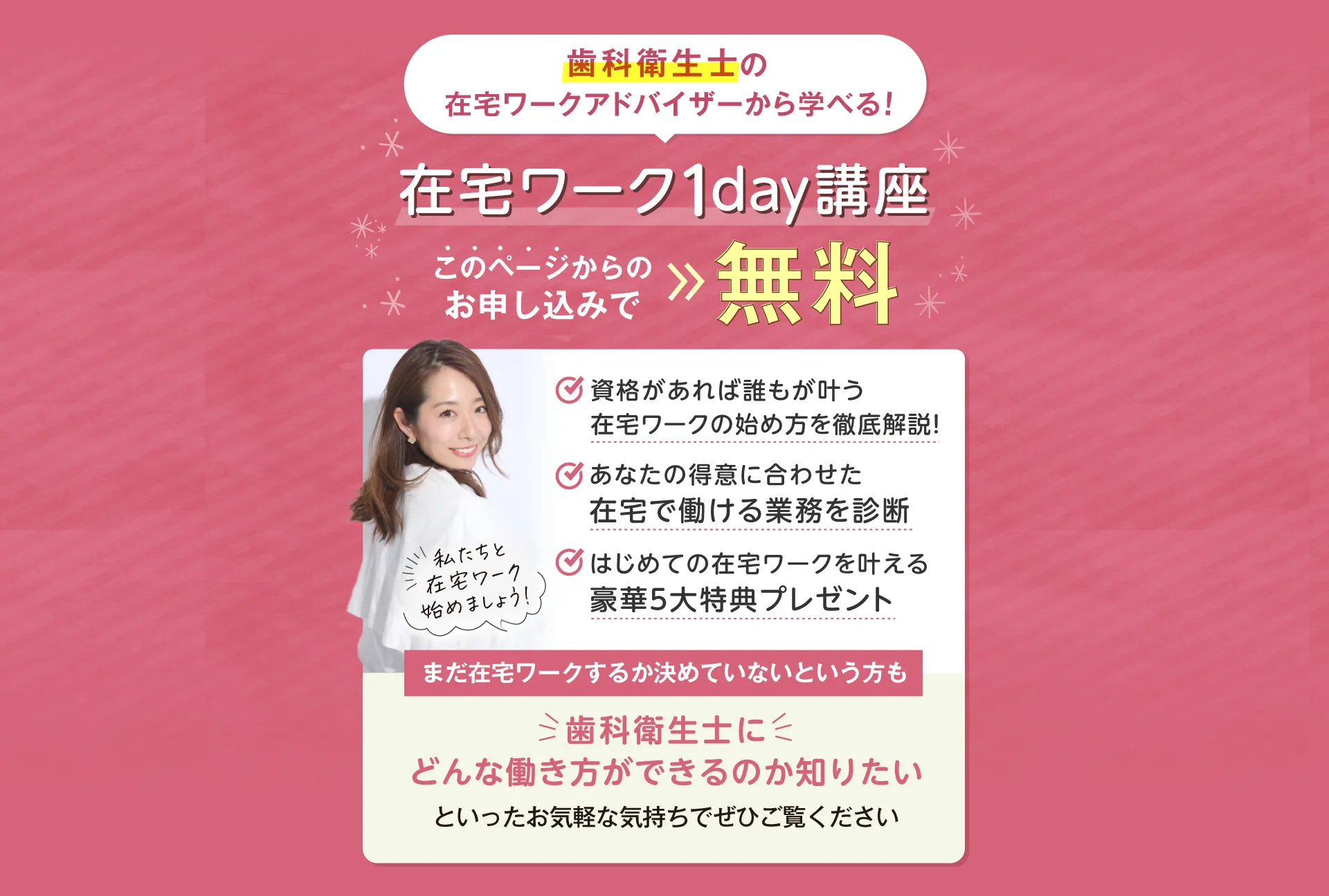 歯科衛生士の国家資格をお持ちの方であればどなたでも実現できる働き方ですのでご安心ください。